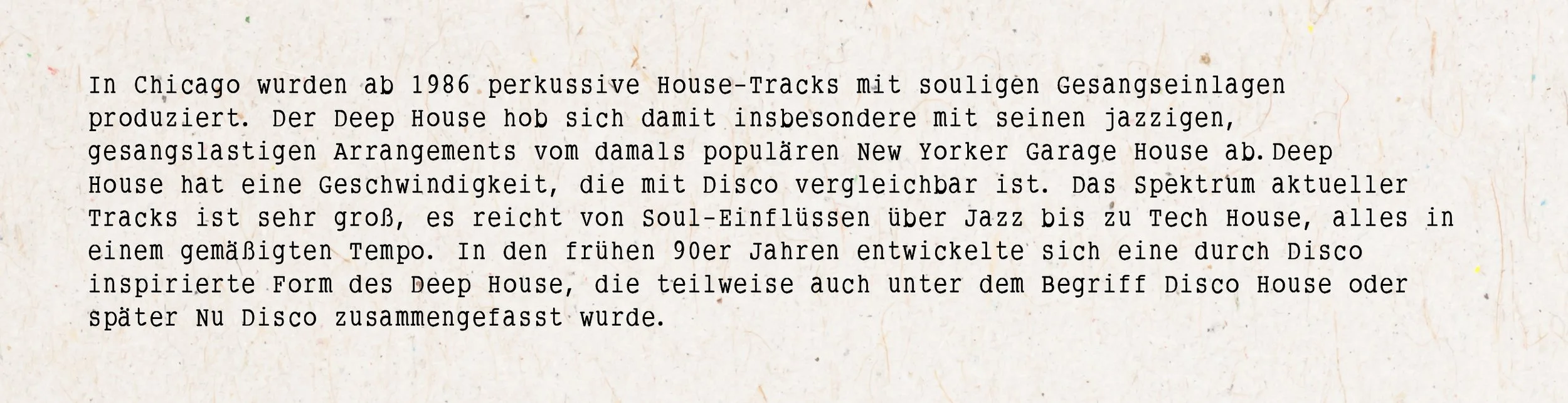 Starting in 1986, percussive house tracks with soulful vocal elements were produced in Chicago. This gave deep house its distinctive character, especially with its jazzy, vocal-heavy arrangements, setting it apart from the then-popular New York garage house. Deep house runs at a tempo comparable to disco. The spectrum of current tracks is broad – ranging from soul and jazz influences to tech house – all at a moderate pace. In the early ’90s, a disco-inspired form of deep house emerged, later referred to as disco house or, eventually, nu disco.