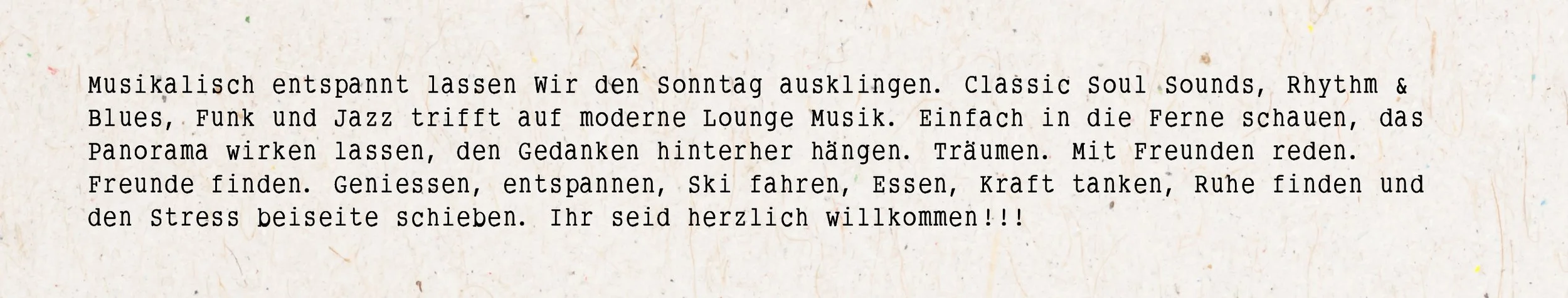 Musically relaxed, we let Sunday wind down. Classic soul sounds, rhythm & blues, funk, and jazz meet modern lounge music. Just gaze into the distance, soak in the panorama, let your thoughts drift. Dream. Talk with friends. Make new ones. Enjoy, unwind, ski, eat, recharge, find peace, and leave stress behind. You are warmly welcome!!!